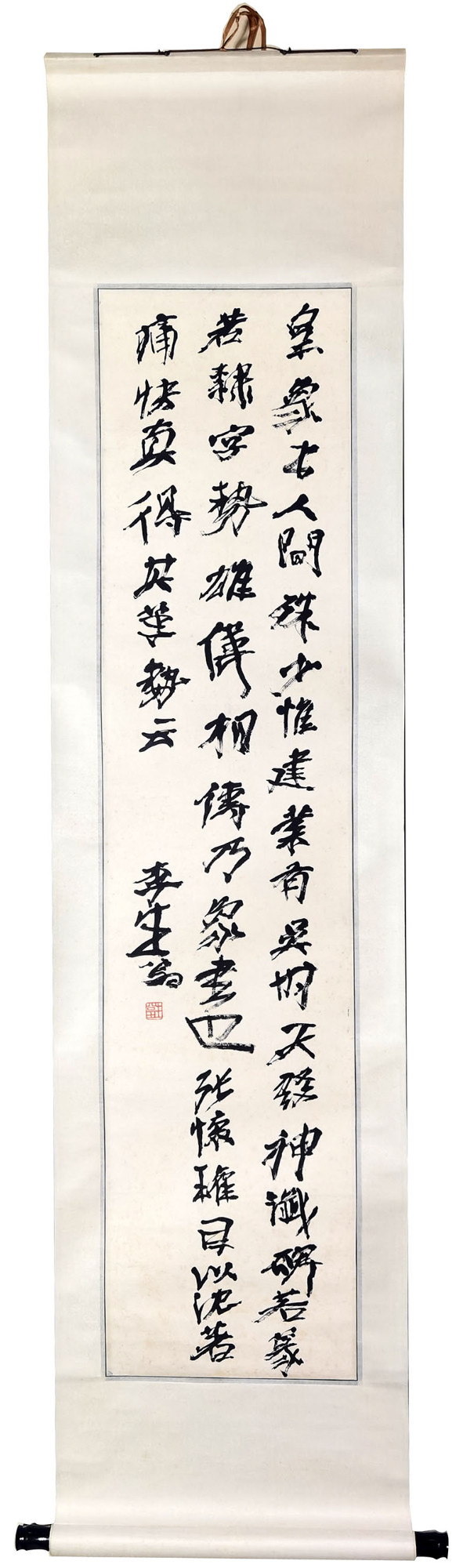 就书法而言,徐生翁初学颜真卿,后宗北碑,对秦汉周金和北魏六朝都悉心临摹,广收博取。诚如他自己所说:“余习隶书二十年,以隶意作真者又十余年,继嫌唐为法缚,乃习篆以窥魏、晋,而魏、晋古茂终逊汉人,遂沿两汉吉金,上攀彝鼎。”从他的小幅扇面作品中,似乎还可以看出他学颜真卿的痕迹,而他的大部分作品,则都是字结体奇崛、生拙古辣,由北碑出,又不受北碑的制约,全然一派独往独来的狂放形象。有时看上去好像完全放弃了用笔,不讲究笔法,但别具情趣。有人称道他的小幅作品,这是因为一些小幅作品他还注意通常意义上的审美习惯,而大部分创作,则不受任何约束。他写字,只是为了写字。为了心灵的需要,而没有写字以外的目的:用不着取悦别人,用不着迎合市场,用不着追逐时风。他几乎把自己封闭起来,不和外界接触。这种纯粹的艺术状态,至为难得。他的字长期不为人称道,但的确是格调高古。更为可贵的是,他的书法体现了一种强烈的风格面貌,具有极强的创新精神。特别是其晚年的书法,铅华洗尽,古朴稚拙,天真自然,达到了炉火纯青,随心所欲的高妙境界。