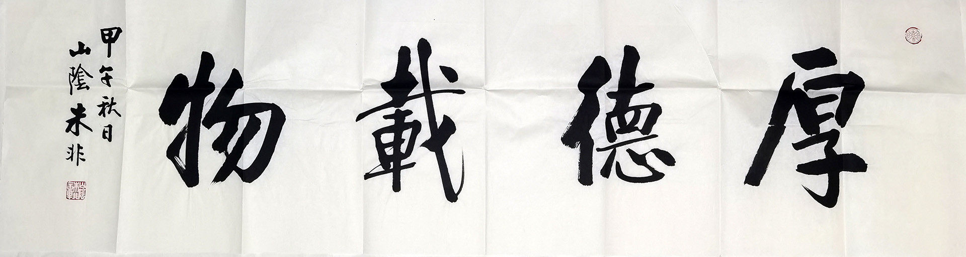 其为古越龙山集团所书碑记,大字深刻,端谨遒深、骨里谨严,具庙堂之气。非斤斤于摹颜拟欧者矣。其行书取法王羲之、米芾、黄山谷、赵孟頫。脱略韵度,而一归于正大。作为书圣故地生于斯长于斯的书家,朱非于书法一道无疑有大期许、大敬畏,因而于书他首重古范,而未敢懈怠泛滥,以宗古自许,而不惮贻字匠之讥。对他的书学立场、观念人们自可仁者见仁、智者见智,自可月旦藏否,但他对书法的敬畏和宗仰却体现出一个书家的价值担当,此乃可贵也欤。