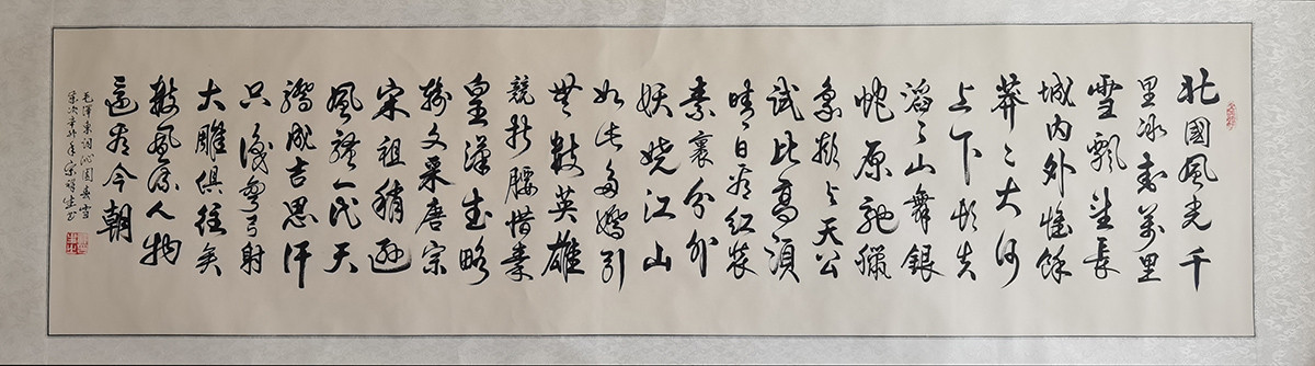 作者:宋祥生 年份:当代 落款内容:毛泽东词沁园春雪,岁次辛卯年宋祥生书。 规格尺寸:字芯:176*46.5,已裱镜片:200*60 作品编号:B284