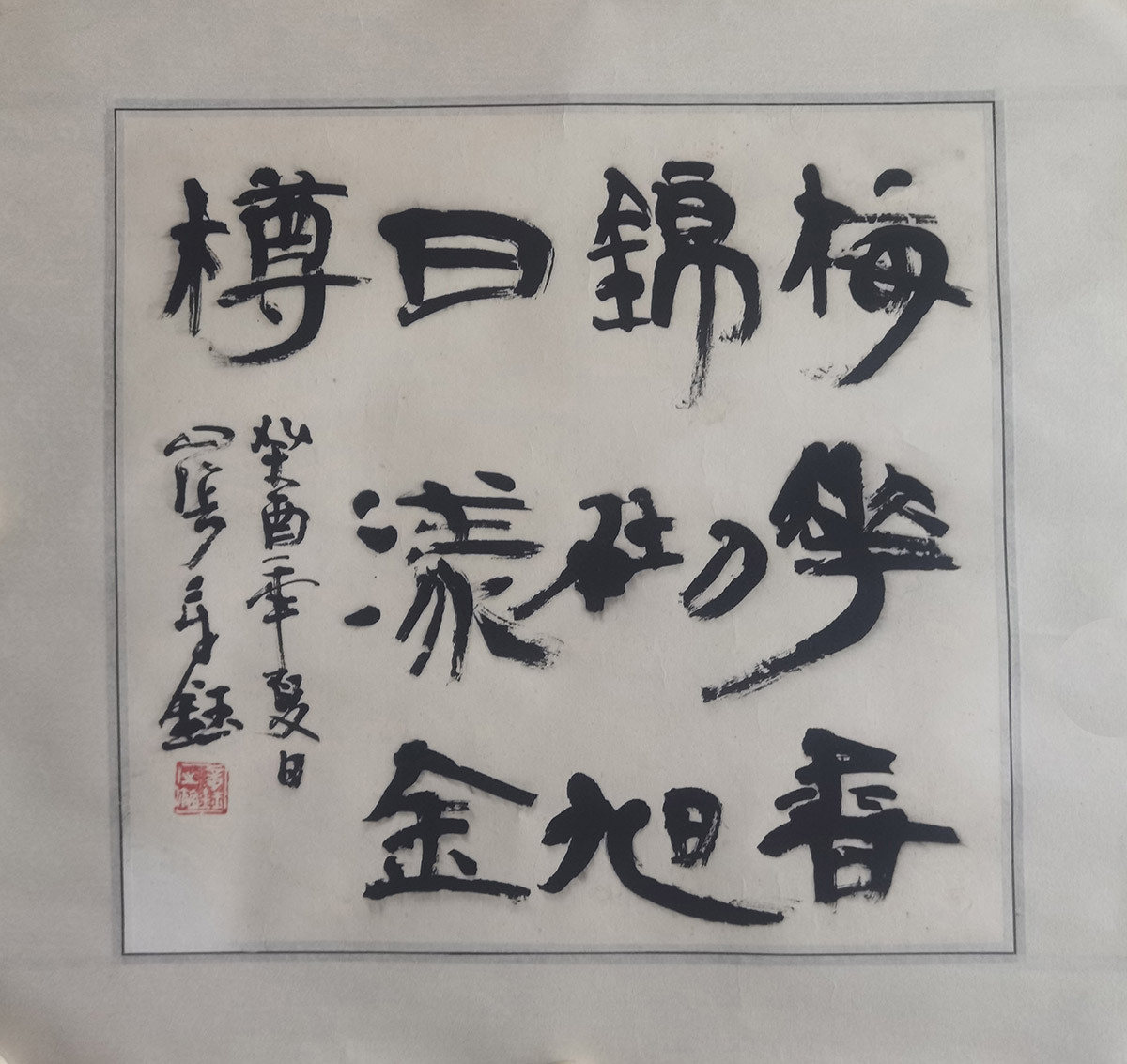 作者:章钰 年份:当代 落款内容:梅花香锦砌,旭日漾金樽,癸酉年夏日,山阴。章钰 规格尺寸:字芯:48*48,已裱镜片:64*64 作品编号:B461~sf0075