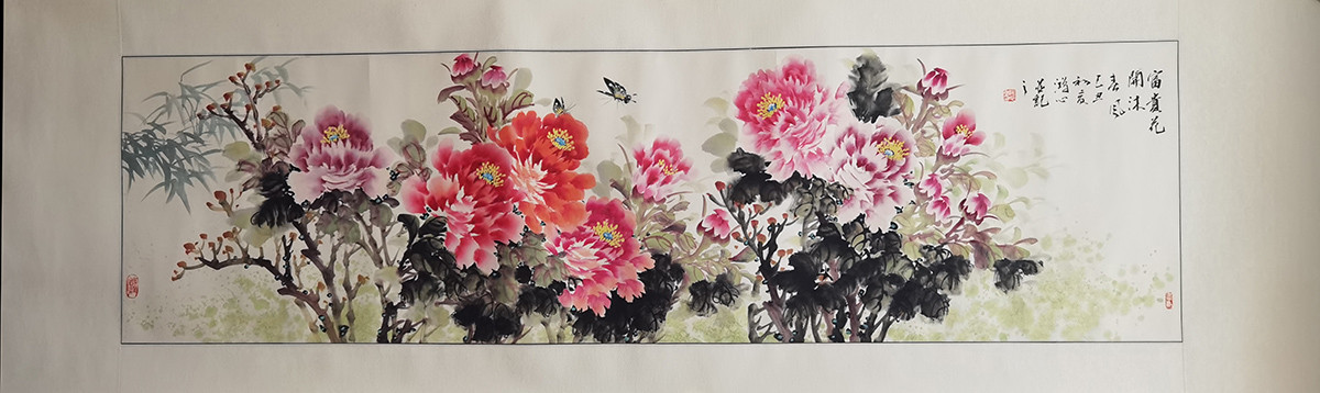 落款内容:富贵花沐春风,已丑年初夏鸿心并记之。