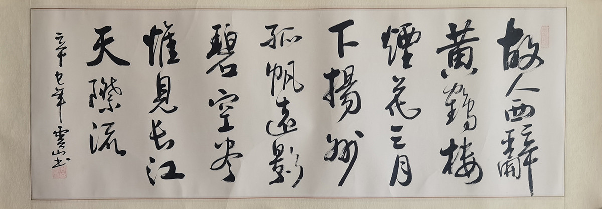 作者:云山 年份:当代 落款内容:故人西辞黄鹤楼,烟花三月下扬州,孤帆远影碧空尽,唯见长江天际流,辛已年云山书。 规格尺寸:字芯:94*32,已裱镜片:110*40 作品编号:B371