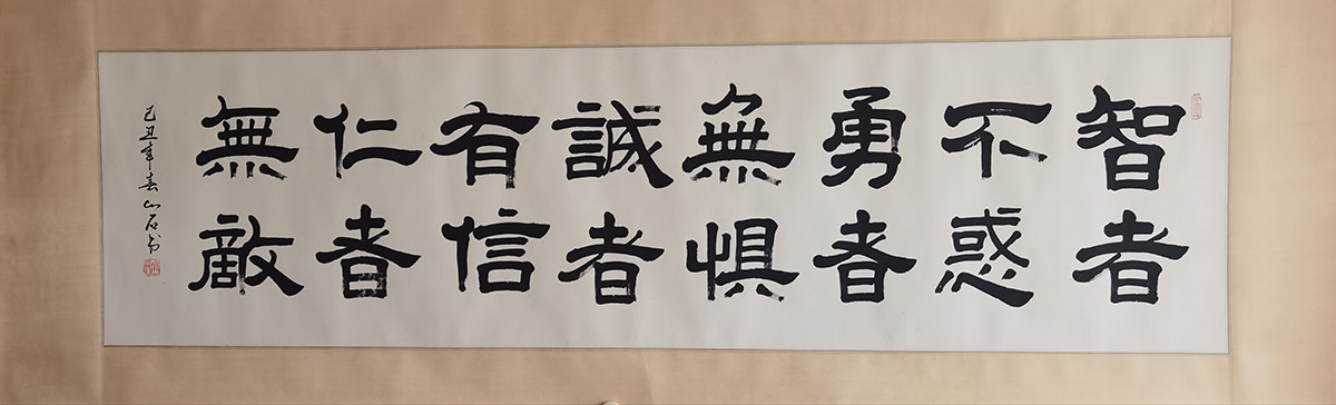 落款内容:智者不惑,勇者无惧,诚者有信,仁者无敌,乙丑年春,山石书。