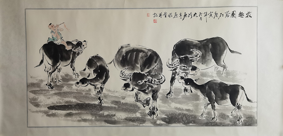 落款内容:牧趣图,岁在庚寅年冬月,九如居主人画牧童并记。