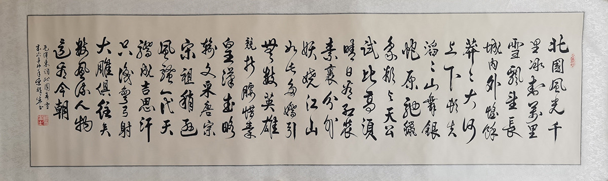 作者:宋祥生 年份:当代 落款内容:毛泽东词沁园春雪,岁次辛卯年宋祥生书。 规格尺寸:字芯:176*46.5,已裱镜片:200*60 作品编号:B283~sf0035