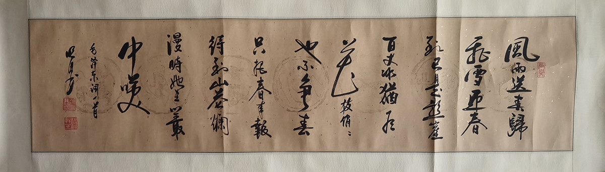 作者:明月 年份:当代 落款内容:毛泽东词一首,明月书。 规格尺寸:字芯:130*32,已裱镜片:150*45 作品编号:B347