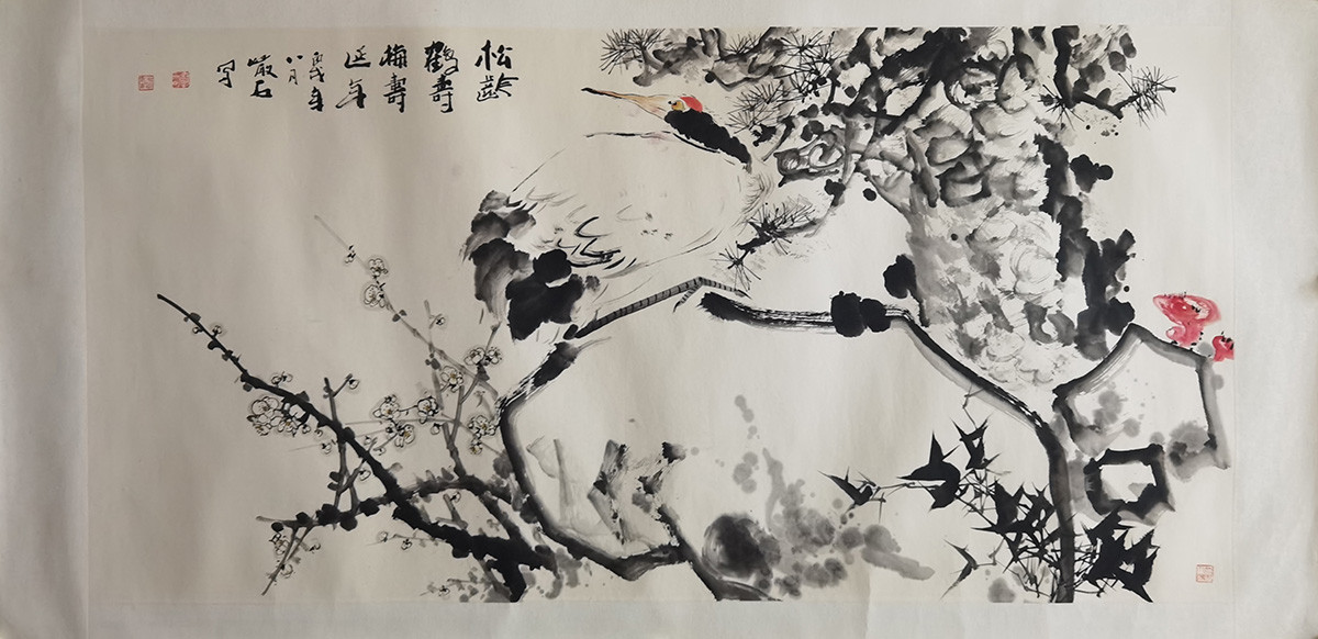 落款内容:松龄鹤寿梅寿延年,丙戌年八月严石写。