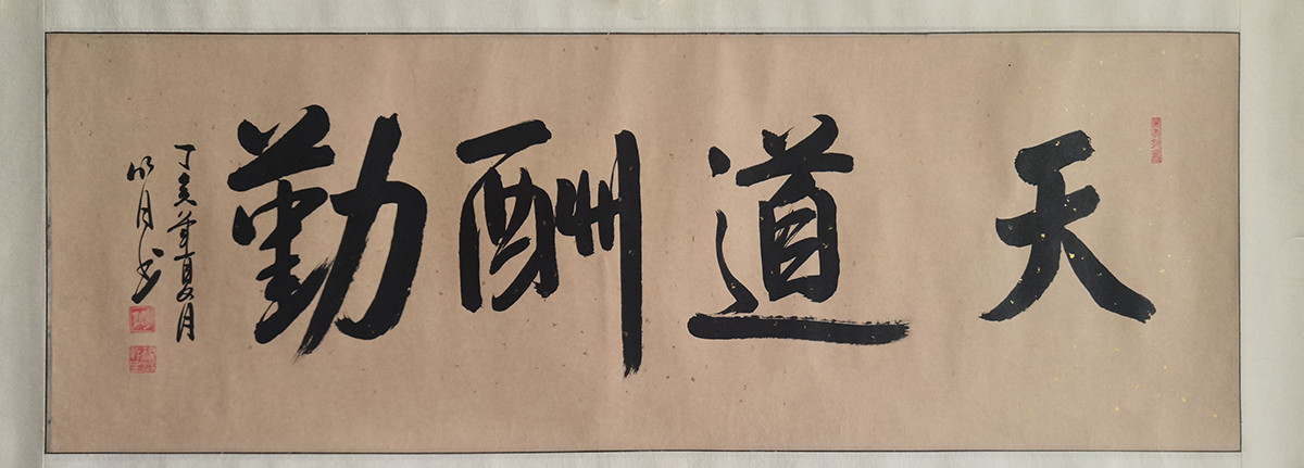 作者:明月 年份:当代 落款内容:天道酬勤,丁亥年夏月明月书。 规格尺寸:字芯:94*32,已裱镜片:108*39.5 作品编号:B489~sf0080