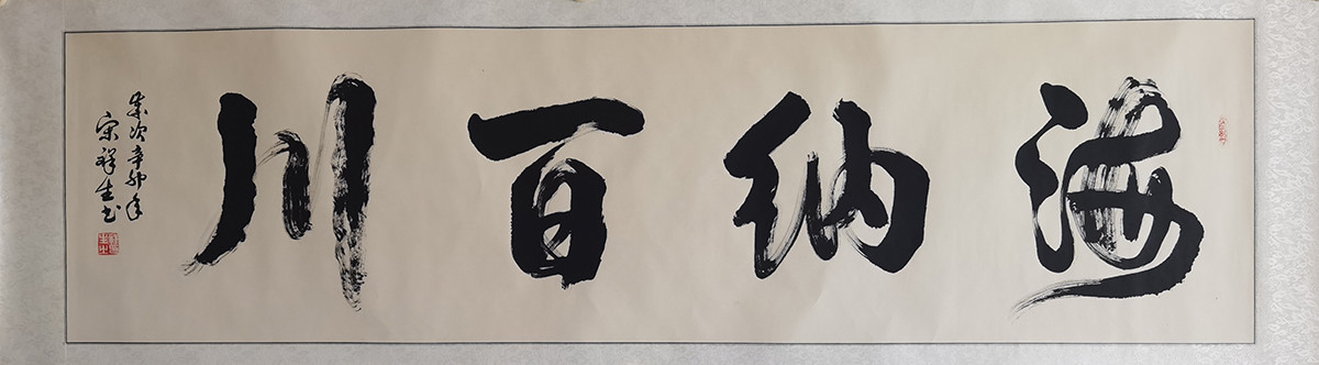 作者:宋祥生 年份:当代 落款内容:海纳百川,岁次辛卯年,宋祥生书。 规格尺寸:字芯:176*47,已裱镜片:200*60 作品编号:B216