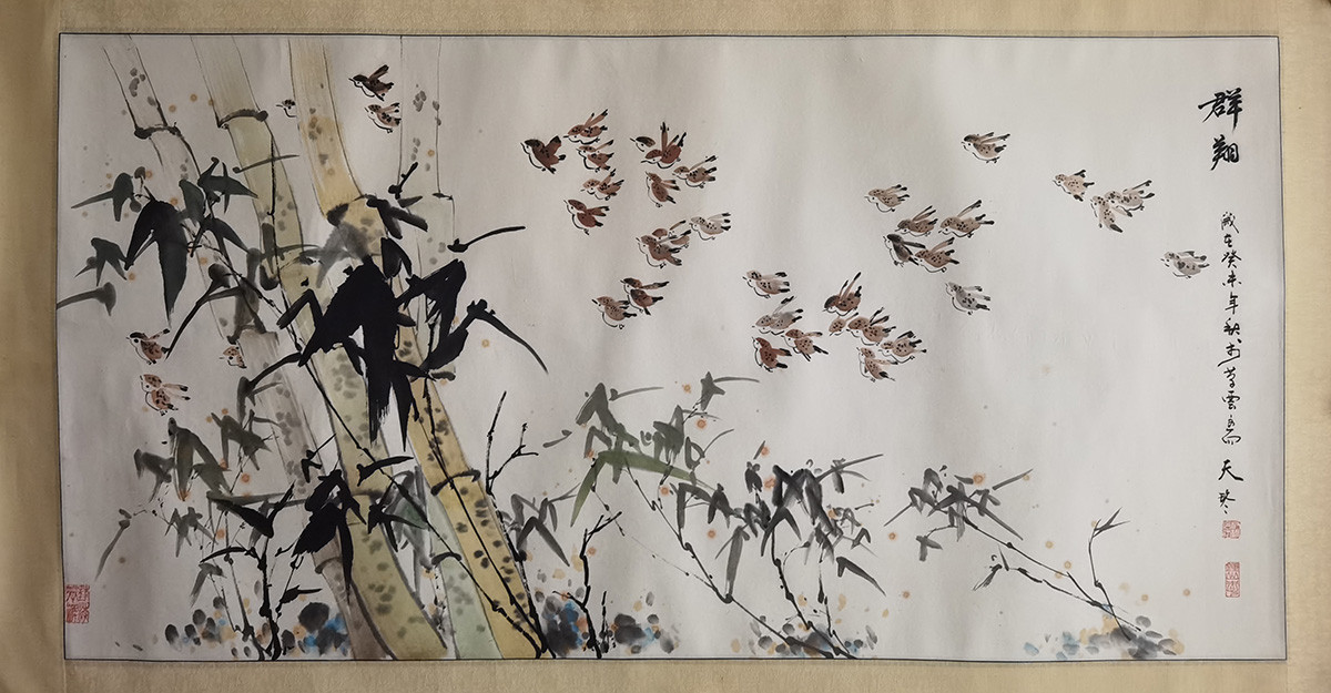 作者:天琴 年份:当代 落款内容:群翔,岁在癸末年秋于芓云斋,天琴。 规格尺寸:画芯:132*68,已裱镜片:150*80 作品编号:B343