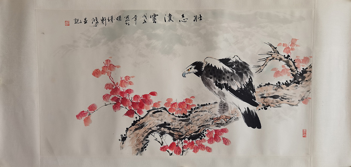 落款内容:壮志凌云,戊子年写于明珠轩,鸿心并记。