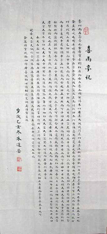 自幼喜爱书法, 对颜、王字体研习最勤。朱字在颜体基础上创新, 体态如鼓, 用笔明断而暗连, 形静而意动, 有鲜明的艺术个性, 时人多以“朱体”相称。所书小楷, 神形兼备, 独树一格。张爱萍将军亲笔给信, 盛赞朱“书法功底之深, 甚为敬佩”。