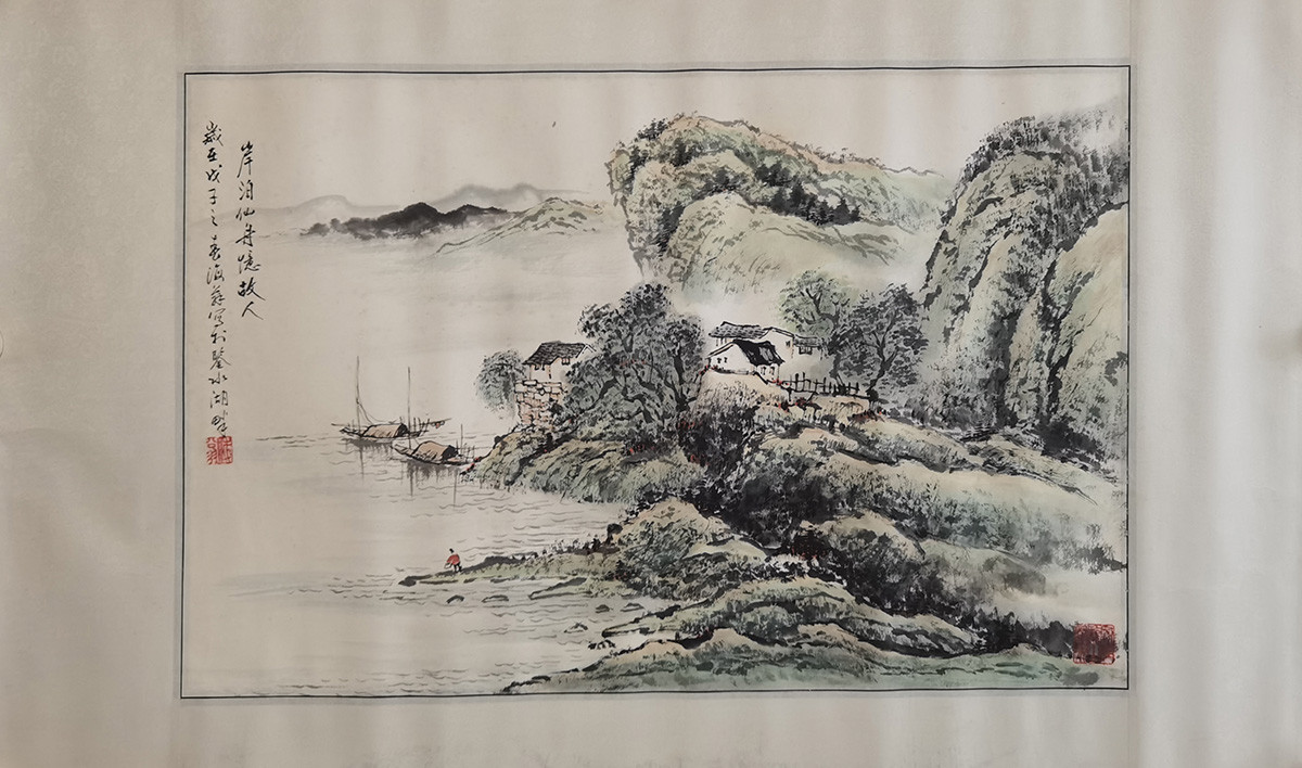 落款内容:岸泊仙舟憶故人,岁在戊子之春,海翁写于鉴水湖畔。