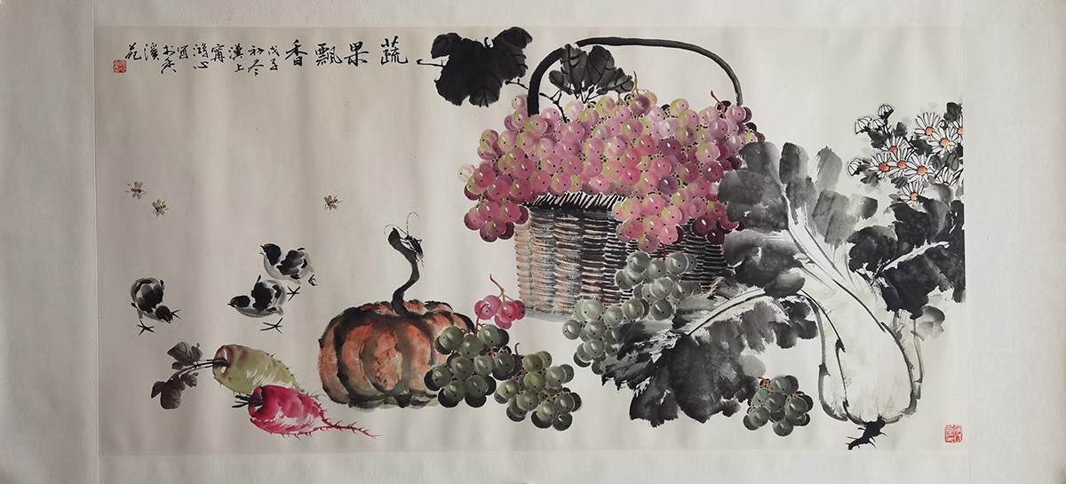 落款内容:蔬果飘香,戊子初冬汉上寗鸿心于香溪苑。