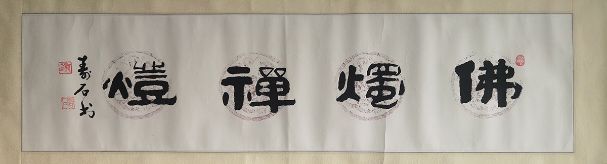 作者:寿石 年份:当代 落款内容:佛烛神燈,寿石书。 规格尺寸:字芯:129*34,已裱镜片:148*44.5 作品编号:B432