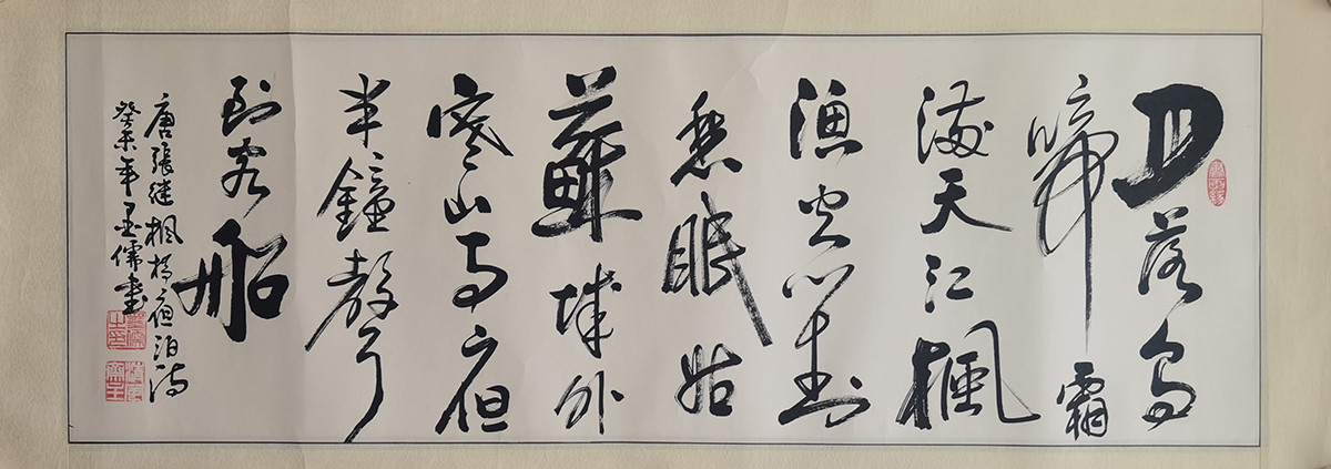 落款内容:月落乌啼霜满天,江枫渔火对愁眠。姑苏城外寒山寺,夜半钟声到客船。唐张继枫桥夜泊诗,癸末年墨儒书。