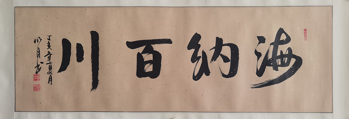作者:明月 年份:当代 落款内容:海纳百川,丁亥年夏月明月书。 规格尺寸:字芯:94*32,已裱镜片:108*39.5 作品编号:B490~sf0081