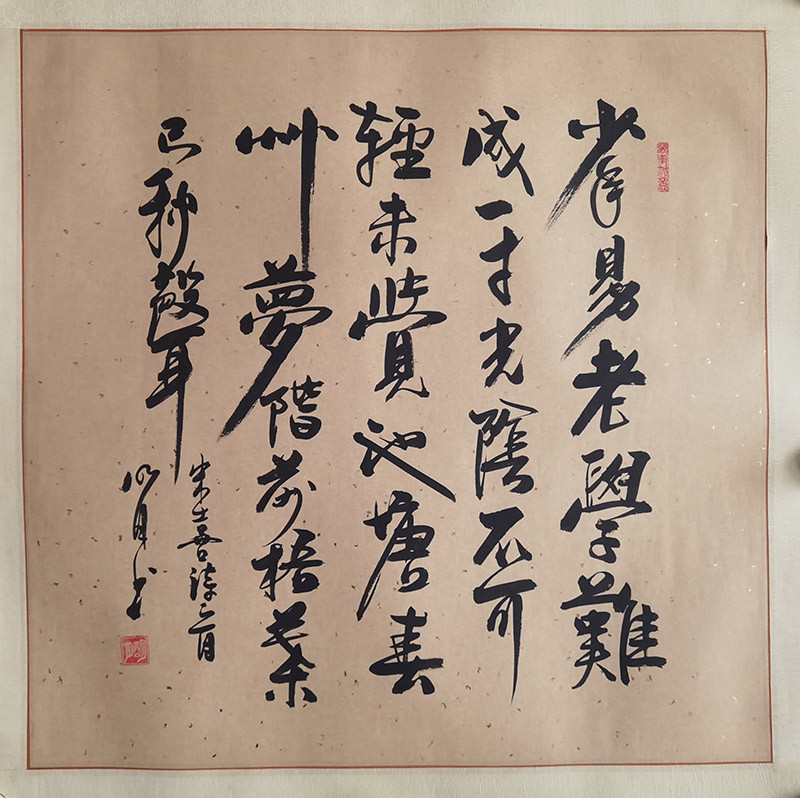 作者:明月 年份:当代 落款内容:少年易老学难成,一寸光阴不可轻。未觉池塘春草梦,阶前梧叶已秋声。朱熹诗一首,明月书。 规格尺寸:字芯:50*50,已裱镜片:60*60 作品编号:B266~sf0025