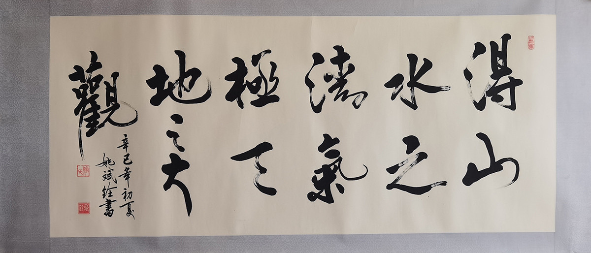 作者:姚斌铨 年份:当代 落款内容:得山水之清气,极天地之大观。辛巳年初夏,姚斌铨书。 规格尺寸:字芯:127*54,已裱镜片:158*66 作品编号:B231