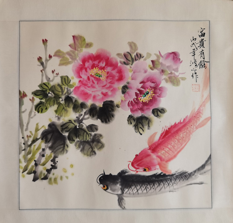 落款内容:富贵有余,丙戌年鸿心作。