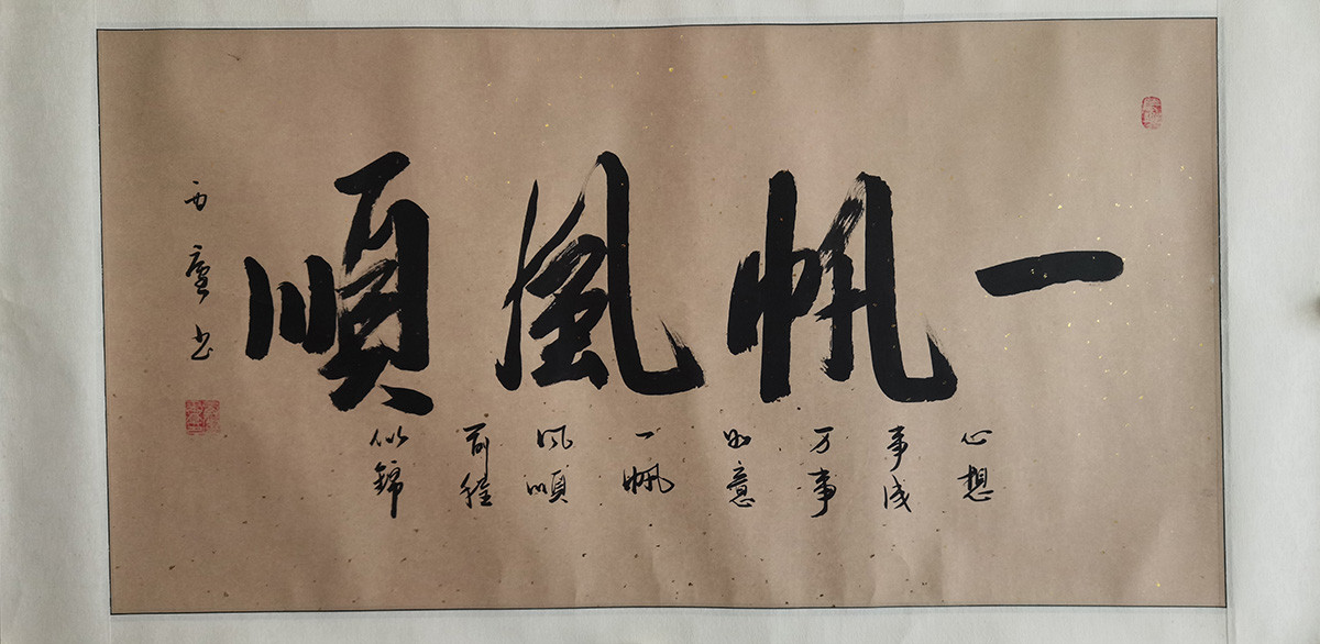 作者:西庐 年份:当代 落款内容:一帆风顺,心想事成,万事如意,一帆风顺,前程似锦,西庐书。 规格尺寸:字芯:96*50,已裱镜片:120*60 作品编号:B153