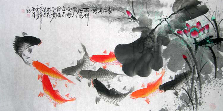 作品名称:何奕兴国画”九鱼图“