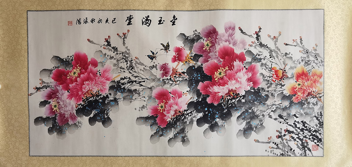 作者:张浩 年份:当代 落款内容:金玉满堂,已亥初秋张浩。 规格尺寸:画芯:136*67.5,已裱镜片:167*83 作品编号:B306