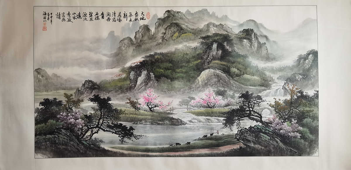 落款内容:大地盎然气象新,晨曦清露润丹青,石桥碧泉源流远,山水秀美寄幽情。甲申年春月海翁作。