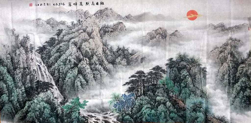 作品名称:三宝国画”红日高照万峰翠“ 作者:三宝 年份:庚寅2010年 规格尺寸:136*68 材质:宣纸 作品编号:gh0210