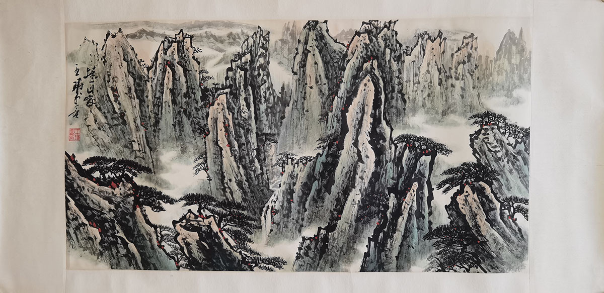 作者:王伟 年份:当代 落款内容:开山峻,王伟于丁亥。 规格尺寸:画芯:89*48,已裱镜片:120*60 作品编号:B59