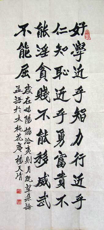 杨天清,本名晏,以字行,别号茜汀,木桃花庵主。浙江省绍兴市人。绍兴市文物管理处顾问。中华诗词学会、浙江省诗词学会会员,越州诗社编辑,中国书画爱好者联谊会、华夏书画学会会员。绍兴县教师进修学校教师(讲师),历任绍兴市、县职工业余学校及教师进修学校等语文、书法教师多年。书法专攻北魏,上溯汉隶、简牍帛书、石鼓、金文和甲文,靡不寝馈于兹,目击道存;故能熔冶古今,别开生面。曾多次参加全国、国际性书法大赛并累获等级奖。书法1990年曾参加炎黄子孙与各国友好书画展获国际二等奖,篆书作品入选华风书画精品赴日展,在日本展出并被收藏。书作被世界教科文卫组织,人民日报社,浙江省委,省政府,江西庐山景区,绍兴市博物等收藏。魏碑作品1993年参加中国书画艺术研讨创作编辑笔会获全国二等奖。作品辑入《当代硬笔书法家辞林》。作品(简历)收入《当代书画家福寿作品大观》、《中国当代楹联墨迹集》、《中国古诗名篇书法精粹》、《当代诗词手迹选》、《世界华人书画篆刻家大辞典》、《世界美术集》(华人卷)、《世界当代著名书画家真迹博览大典》和《世界名人录》(中国卷·1)等30余部大型辞书。